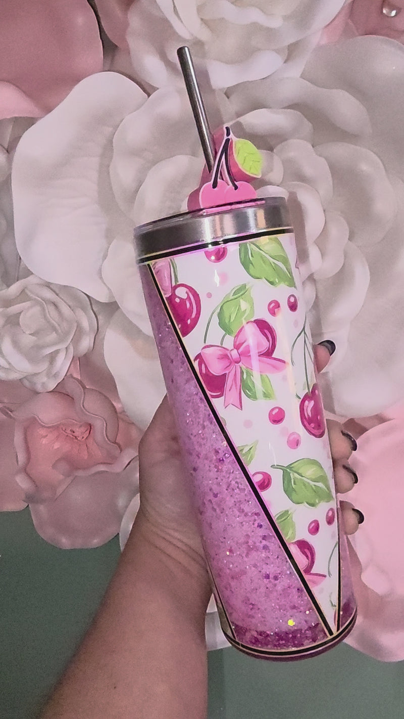 You will receive tumbler pictured. This is a 20oz stainless steel snow globe tumbler that has been epoxied over. It will come with everything shown, tumbler, lid, straw, and 3d printed straw topper are included. Tumbler will come with permanent signature on bottom. Solution is a slower flow so the glitter will stay suspended for a bit, but will eventually fall and tumbler will need to be shaken well to distribute the glitter again.