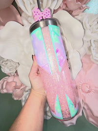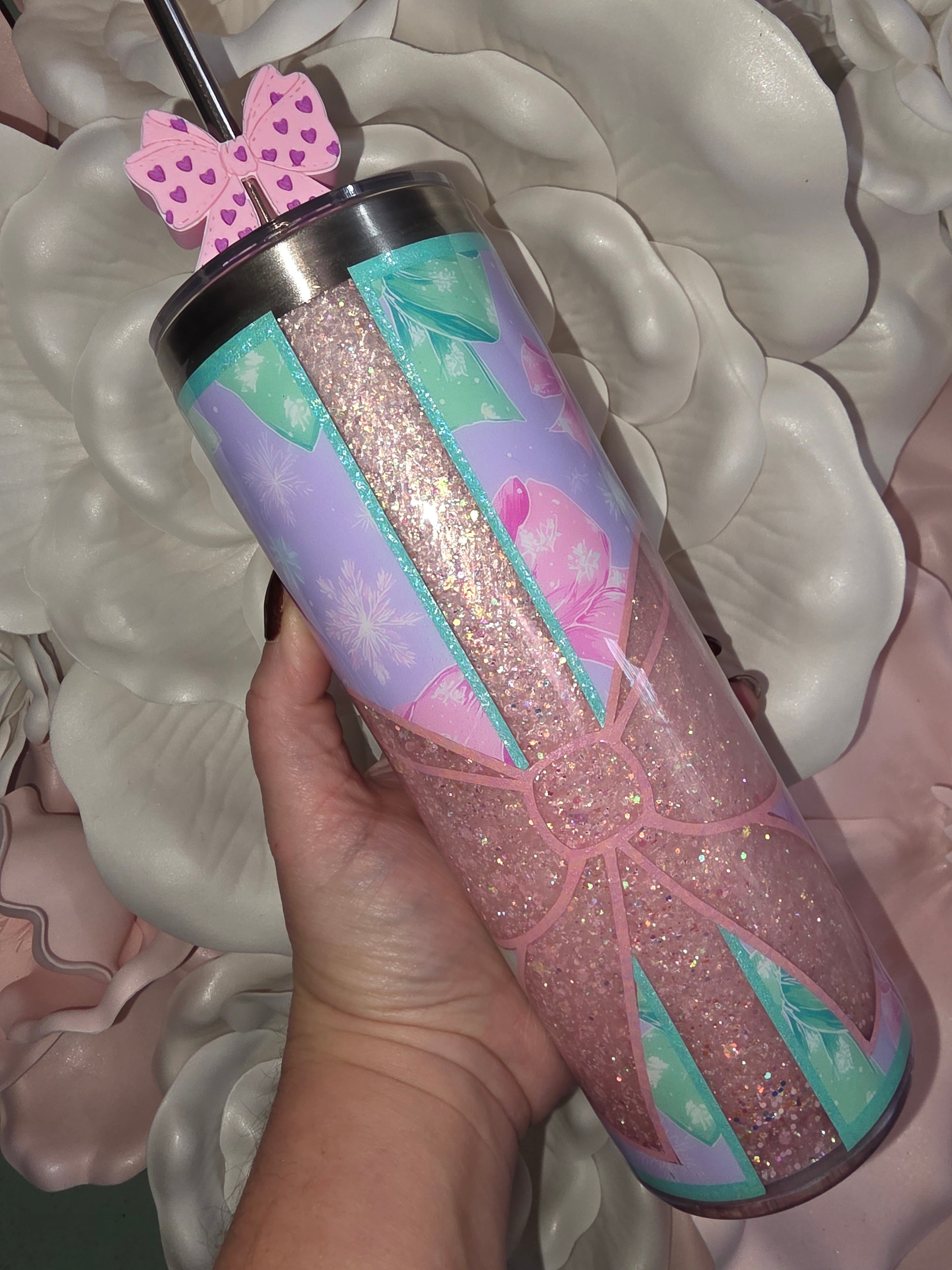 You will receive tumbler pictured. This is a 20oz stainless steel snow globe tumbler that has been epoxied over. It will come with everything shown, tumbler, lid, straw topper and straw are included. Tumbler will come with permanent signature on bottom. Solution is a slower flow so the glitter will fall eventually and tumbler will need to be shaken well to distribute the glitter again.