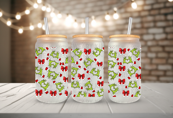 Green Man Fuzzy Bows UV Dtf 16oz glass can wrap