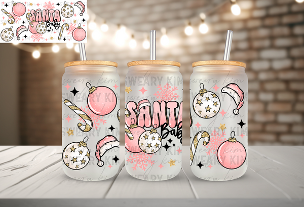 Pink Santa Baby UV Dtf 16oz glass can wrap